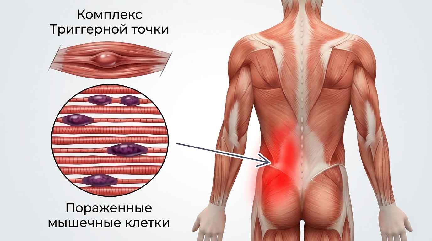 Триггерная точка — это участок повышенной чувствительности в мышце, который вызывает боль при надавливании и может отдавать в другие зоны