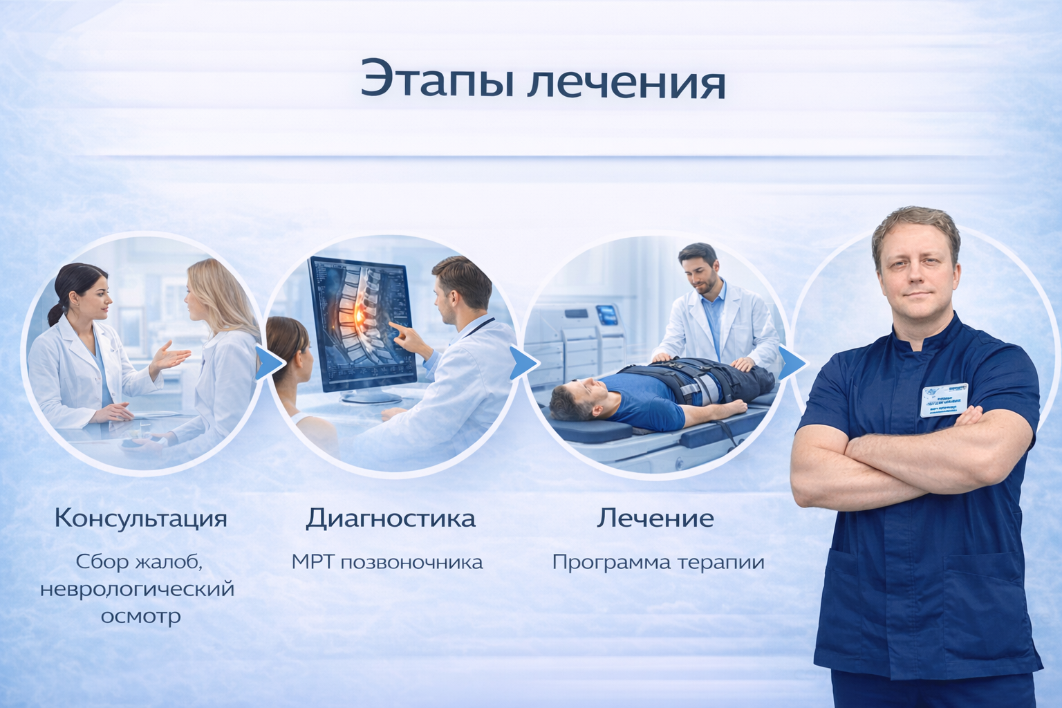 Все процедуры подбираются строго индивидуально — с учётом стадии дегенеративных изменений, размеров и локализации протрузии по данным МРТ, а также общего состояния пациента.