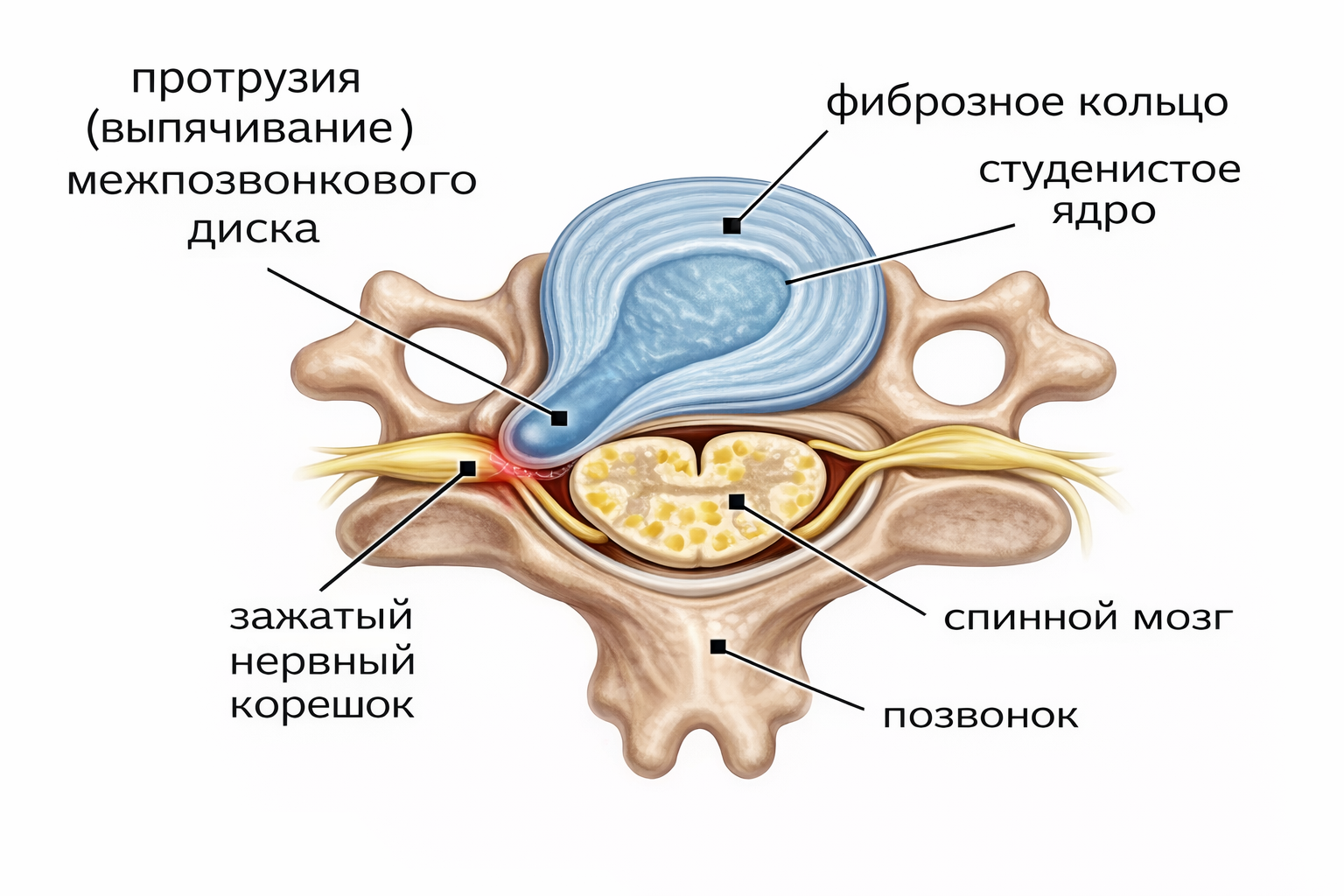 Это патологический процесс, при котором содержимое межпозвонкового диска выпячивается за пределы фиброзного кольца, но сам диск остаётся целым.