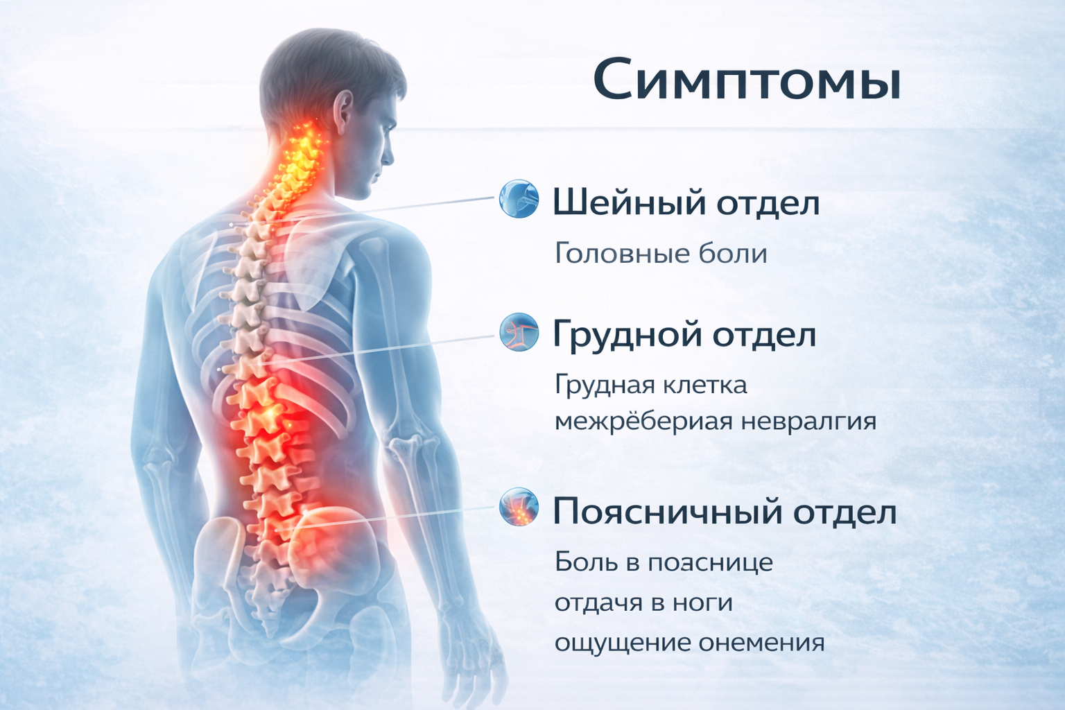 Симптомы зависят от отдела позвоночника и размера протрузии: