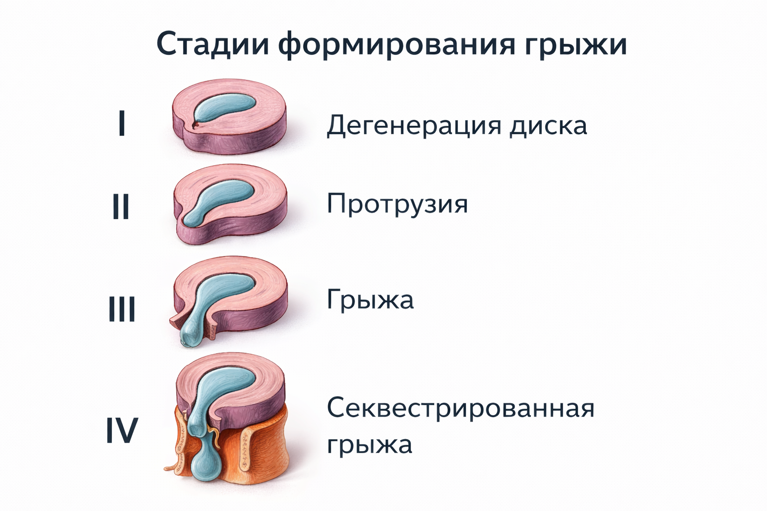 Все эти факторы приводят к нарушению кровоснабжения и питания диска, что запускает дегенеративные процессы.